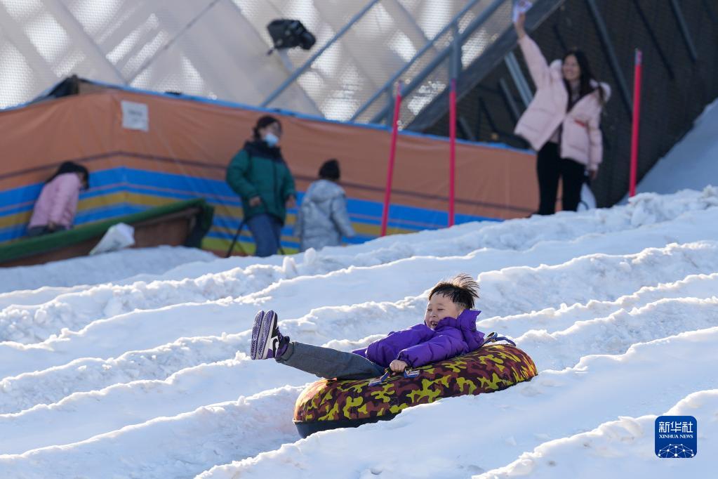 2023年1月31日,一名小朋友在首鋼滑雪大跳臺體驗“雪圈沖浪”。新華社記者 鞠煥宗 攝