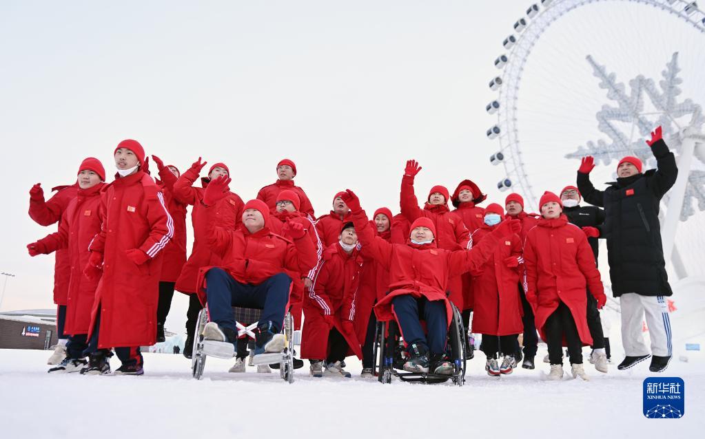 2023年2月9日,黑龍江省殘疾人后備運動員集訓隊在第七屆中國殘疾人冰雪運動季北方主場活動現(xiàn)場合影。新華社記者 李賀 攝