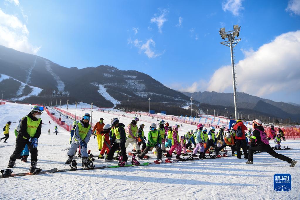 2023年1月11日,滑雪冬令營學員在陜西太白鰲山滑雪度假區(qū)教練的帶領下熱身。新華社發(fā)(鄒競一攝)