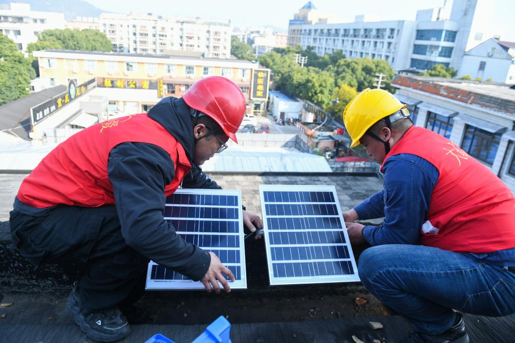 2023年2月20日,浙江余姚市大城小愛公益服務(wù)中心的志愿者為老舊小區(qū)安裝光伏發(fā)電板。新華社記者徐昱 攝