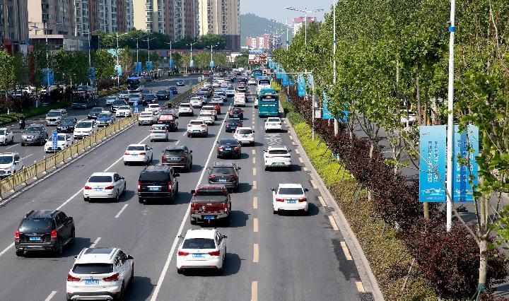 4月27日,山東省濟(jì)南市經(jīng)十路公交車道平峰期允許社會車輛通行。(新華社記者王陽攝)