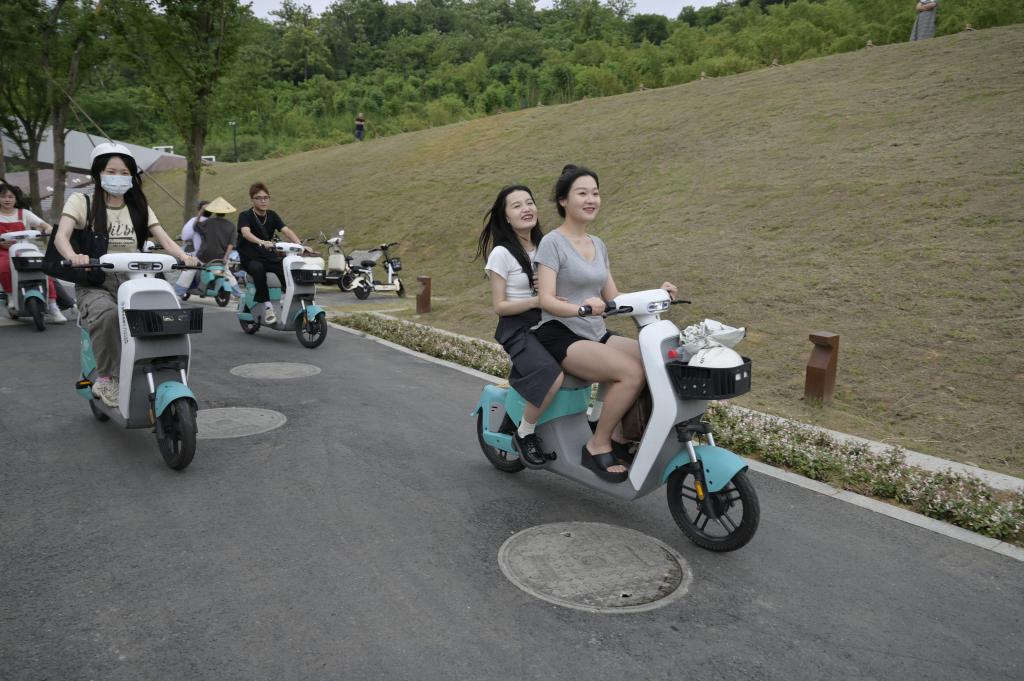 6月5日,在浙江省湖州市安吉縣天荒坪鎮(zhèn)余村,年輕人騎共享電動(dòng)車(chē)游玩。新華社記者才揚(yáng) 攝