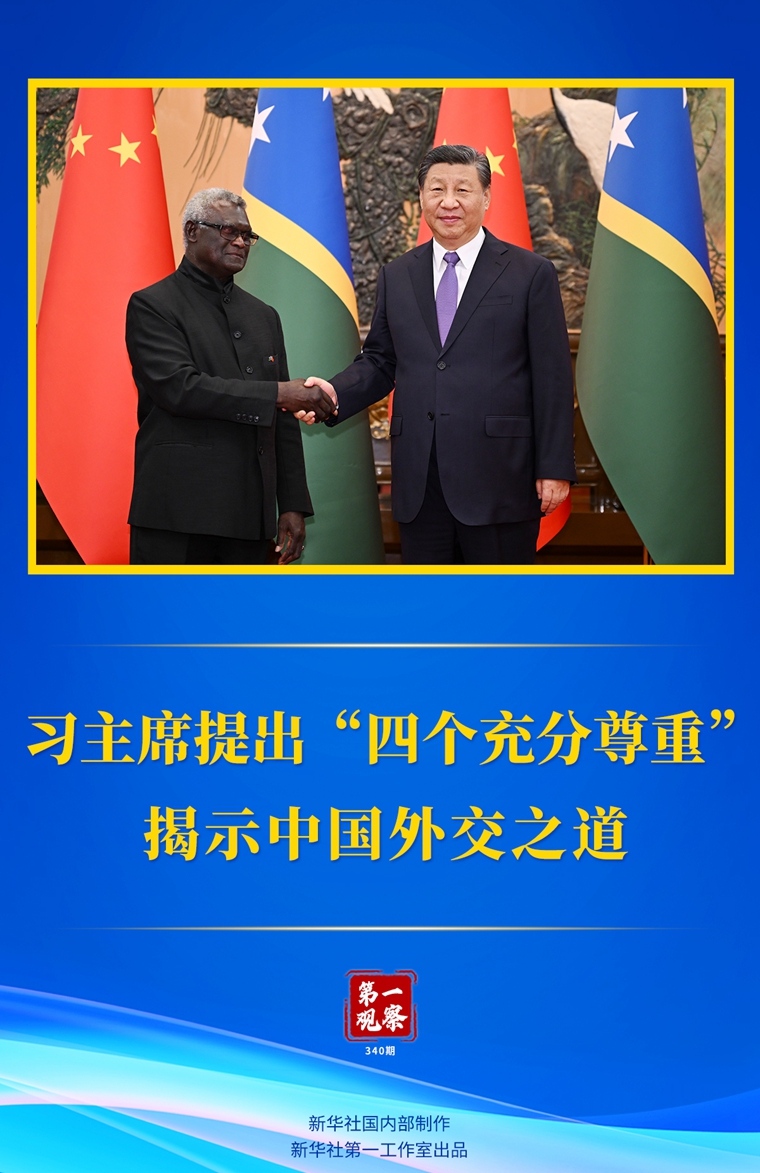 7月10日下午,國家主席習近平在人民大會堂會見來華進行正式訪問的所羅門群島總理索加瓦雷。會見中,習近平主席指出,中國的太平洋島國政策秉持“四個充分尊重”——