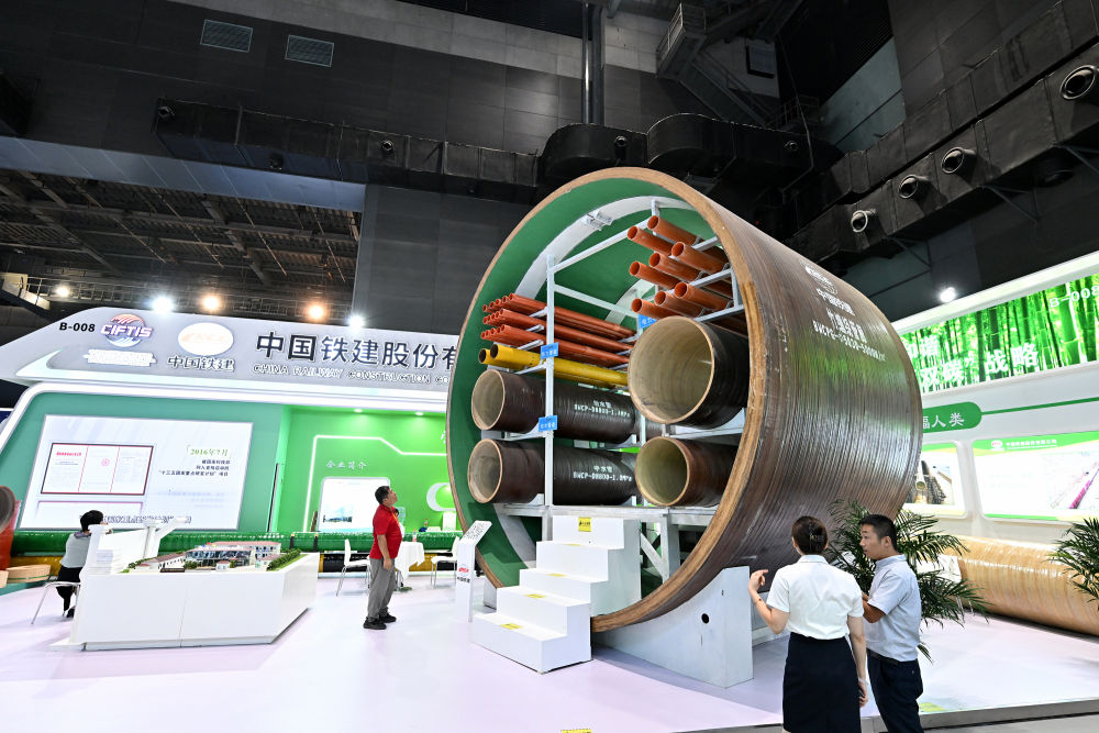 9月2日,在國家體育館舉行的服貿(mào)會環(huán)境服務(wù)專題展上,客商在中國鐵建展位竹纏繞管廊旁了解信息。新華社記者 李鑫 攝