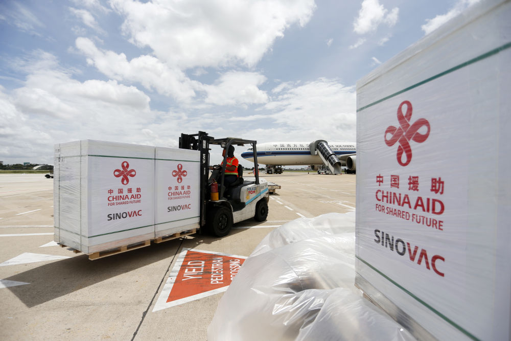 工作人員在柬埔寨金邊國際機(jī)場運(yùn)輸中國政府援助柬埔寨的科興新冠疫苗(2021年10月14日攝)。新華社發(fā)(批隆攝)