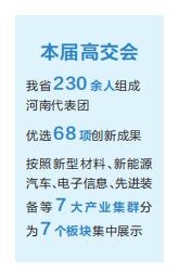 本屆高交會以“激發(fā)創(chuàng)新活力 提升發(fā)展質(zhì)量”為主題,是史上規(guī)模最大、參與國家和地區(qū)最多的一屆高交會。作為高交會的“老朋友”,省商務(wù)廳組織230余人組成河南代表團,在全省優(yōu)選了68項創(chuàng)新成果,按照新型材料、新能源汽車、電子信息、先進裝備、現(xiàn)代食品、現(xiàn)代輕紡、現(xiàn)代醫(yī)藥等7大產(chǎn)業(yè)集群分為7個板塊集中展示,并攜旭陽光電、超聚變、力量鉆石、綠纖股份、未來星機器人等16家企業(yè)亮相。
