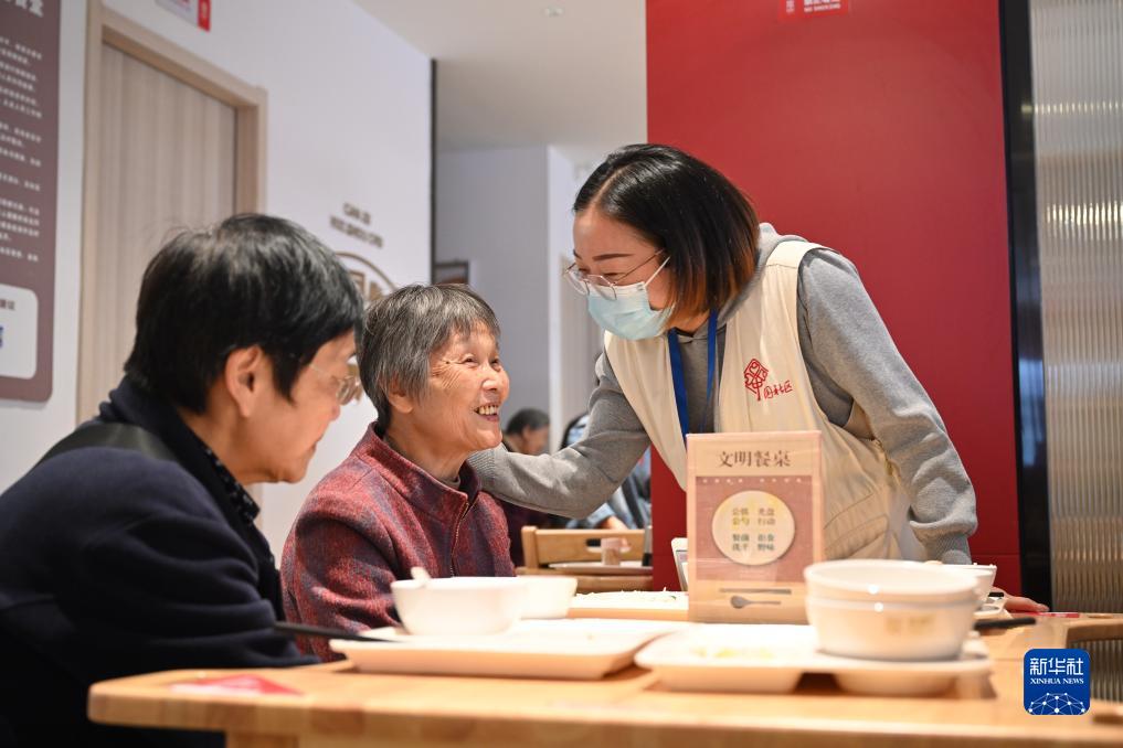 2023年11月16日,社區(qū)工作人員在福州市鼓樓區(qū)慶城社區(qū)長者食堂內(nèi)與用餐老人交流。新華社記者 姜克紅 攝