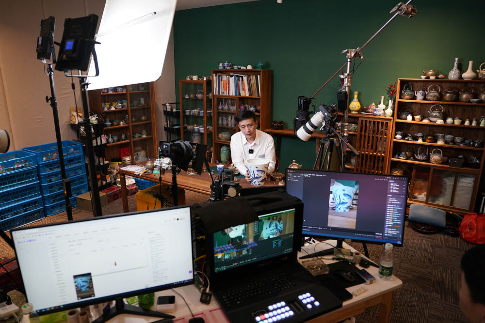 在江西景德鎮(zhèn)陶溪川文創(chuàng)街區(qū)的直播基地里,工作人員通過網(wǎng)絡直播推介陶瓷產(chǎn)品(2023年2月22日攝)。新華社記者 周密 攝