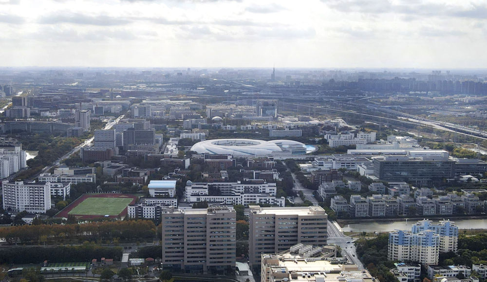 這是2023年11月25日在上海浦東新區(qū)張江科學(xué)城拍攝的形如鸚鵡螺的大科學(xué)裝置上海光源(中)(無(wú)人機(jī)照片)。新華社記者 方喆 攝