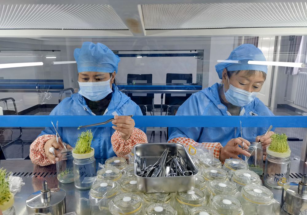 ??技術人員在河北省張家口市德勝村一處育種室內培育微型馬鈴薯瓶苗(2024年2月4日攝)。新華社發(fā)
