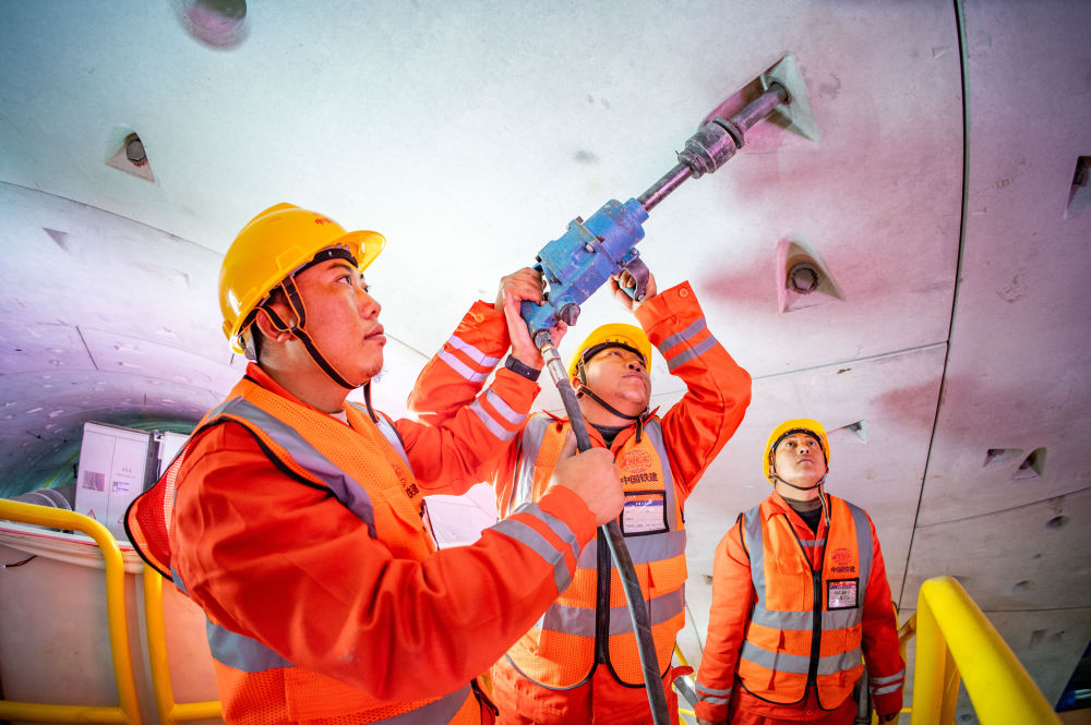 ??在中鐵十四局京唐城際鐵路運潮減河隧道內,施工人員在拼裝管片(2024年2月4日攝)。新華社發(fā)(中鐵十四局供圖)