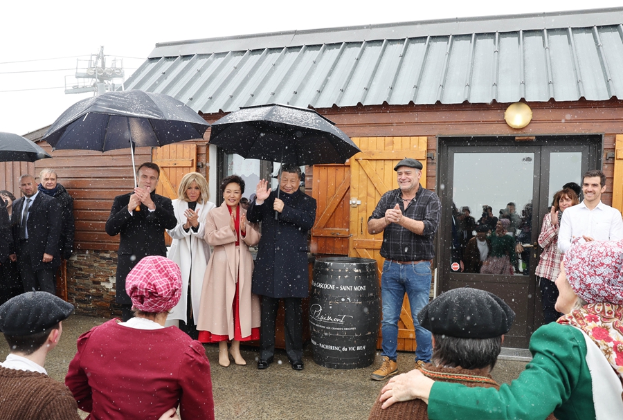 ??當(dāng)?shù)貢r(shí)間5月7日,應(yīng)法國總統(tǒng)馬克龍?zhí)貏e邀請(qǐng),國家主席習(xí)近平乘專機(jī)來到法國西南部上比利牛斯省訪問。在圖爾馬萊山口“牧羊人驛站”,習(xí)近平和夫人彭麗媛同馬克龍和夫人布麗吉特共同欣賞當(dāng)?shù)卮迕癖硌莸木哂袧庥裟戏L(fēng)情的牧羊人之舞。新華社記者 姚大偉 攝