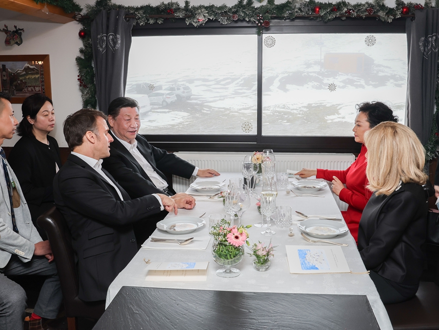 ??驛站木屋外,春雪紛飛,云海浩渺。兩國元首夫婦憑窗而坐,遠(yuǎn)眺群山,品當(dāng)?shù)靥厣牢叮撎煜嘛L(fēng)云際會(huì),在輕松愉快的氛圍中就一些重要問題進(jìn)行了戰(zhàn)略溝通。
