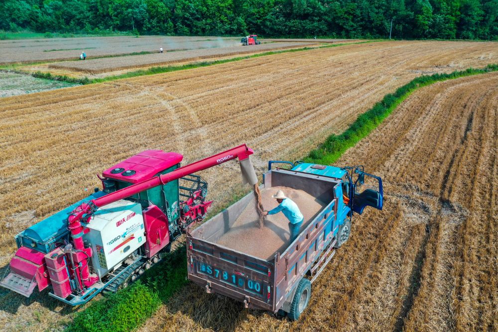 2024年6月1日,在河南省信陽市光山縣南向店鄉(xiāng)何畈村鑫磊合作社,社員將收獲的小麥裝車(無人機照片)。新華社發(fā)(謝萬柏攝)