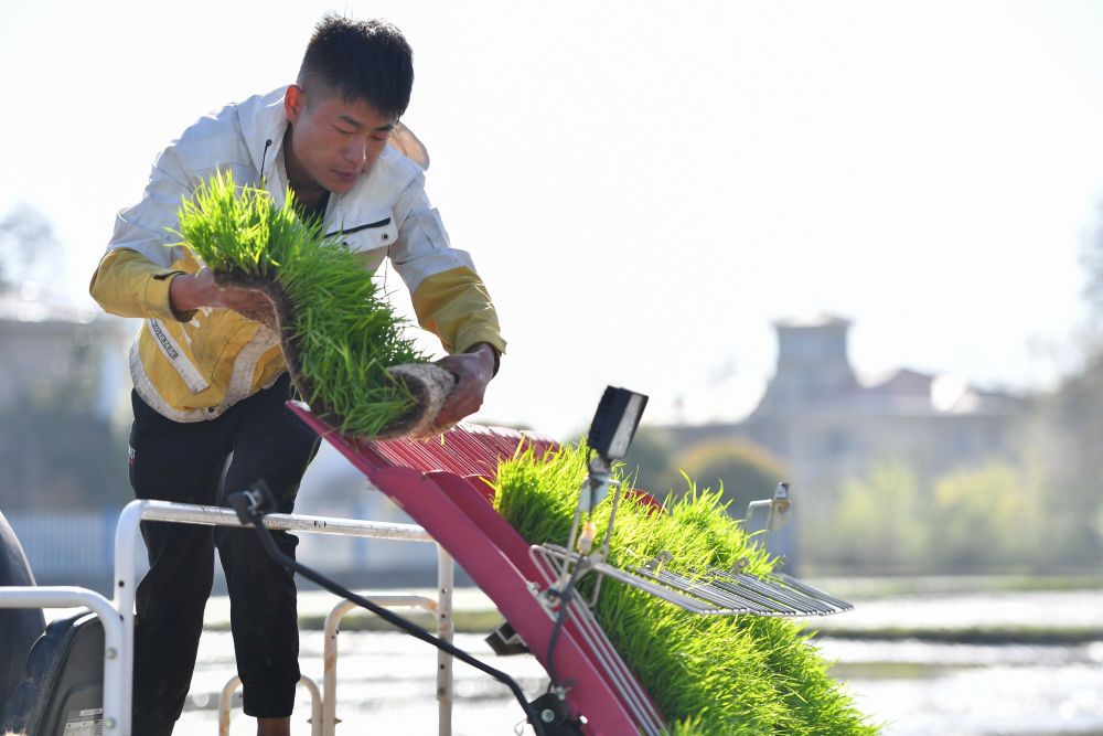 2024年3月29日,在湖南省長沙市望城區(qū)高塘嶺街道沱市村,農戶將秧苗放到插秧機上。新華社記者 陳澤國 攝