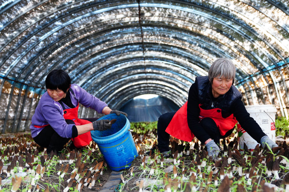 2024年3月20日,農民在山東省濟寧市微山縣驩城鎮(zhèn)袁堂華能光伏電站農光互補項目的大棚里采摘羊肚菌。該項目是采煤塌陷區(qū)綜合整治項目,集農光互補、漁光互補于一體。新華社記者 郭緒雷 攝