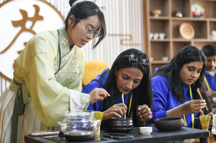 ??2024年4月15日,參加2024年“漢語橋”上合組織國家青年學(xué)生春令營的來華青年學(xué)生在新疆師范大學(xué)學(xué)生(左)的指導(dǎo)下學(xué)習(xí)茶藝。新華社記者 王菲 攝