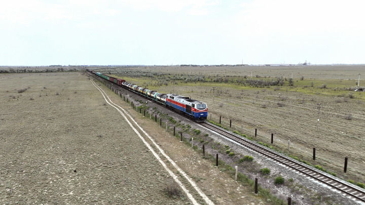 ??2023年5月12日,在哈薩克斯坦阿拉木圖附近,貨運(yùn)列車馳騁于阿拉木圖與中國霍爾果斯間(無人機(jī)照片)。新華社發(fā)(奧斯帕諾夫攝)
