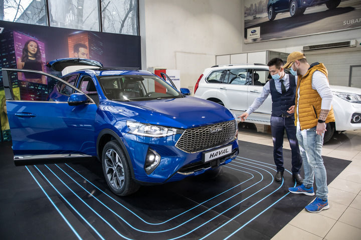 ??2021年4月1日,銷售人員在哈薩克斯坦阿拉木圖市經(jīng)銷商店向消費(fèi)者介紹哈弗汽車。新華社發(fā)(阿斯塔納汽車公司供圖)