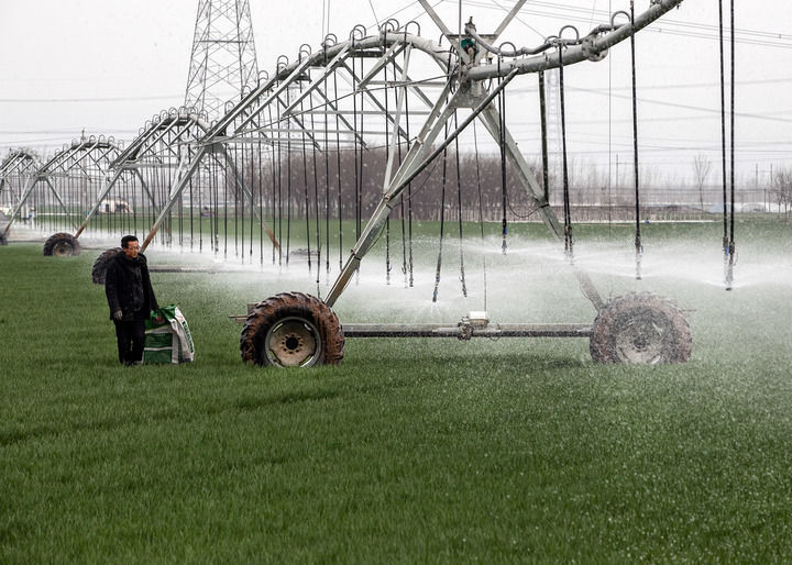 ??2024年3月18日,在河南省焦作市博愛(ài)縣孝敬鎮(zhèn)東原莊村瑞輝家庭農(nóng)場(chǎng),村民使用全自動(dòng)指針式噴灌機(jī)進(jìn)行澆灌作業(yè)。新華社發(fā)(程全攝)