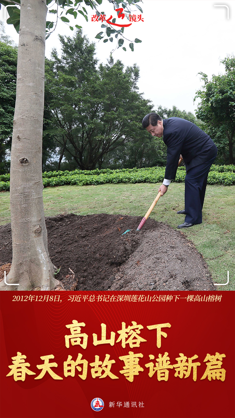 ??高山榕是嶺南本土樹種,四季常綠、蒼勁挺拔。1992年,鄧小平同志在深圳仙湖植物園也曾親手種下一棵高山榕?!案呱介诺奶刭|與堅韌頑強、奮發(fā)向上的改革精神相契合?!睍r任深圳市蓮花山公園管理處主任楊義標說。