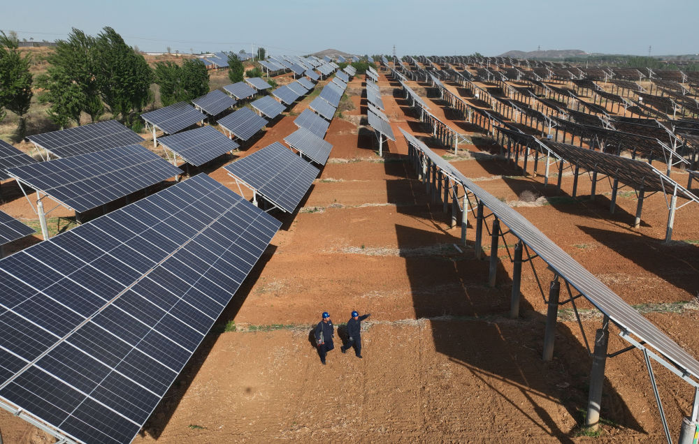 ??2024年4月16日,工人在河北省石家莊市靈壽縣譚莊鄉(xiāng)程家莊村的“農(nóng)光互補(bǔ)”光伏發(fā)電場(chǎng)巡查(無人機(jī)照片)。新華社記者 楊世堯 攝