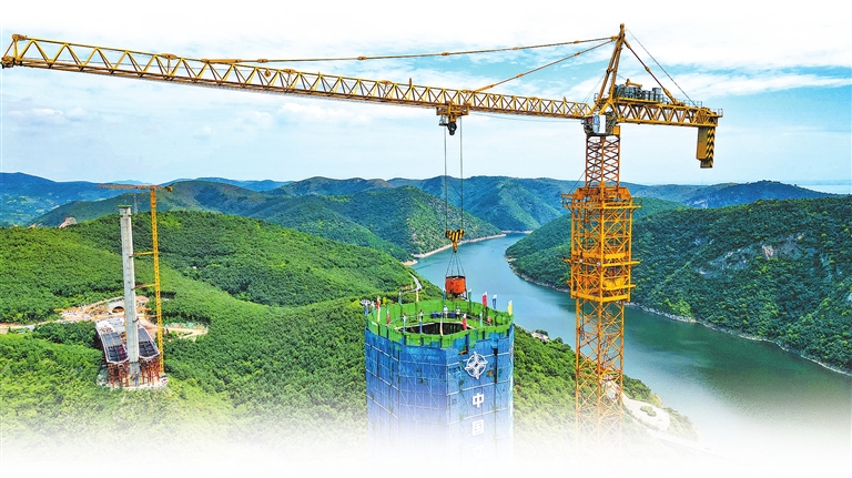 ??8月28日,中交二航局澠淅高速淅川至豫鄂省界段項(xiàng)目丹江小三峽特大橋主塔實(shí)現(xiàn)封頂。 本報(bào)記者 聶冬晗 攝
