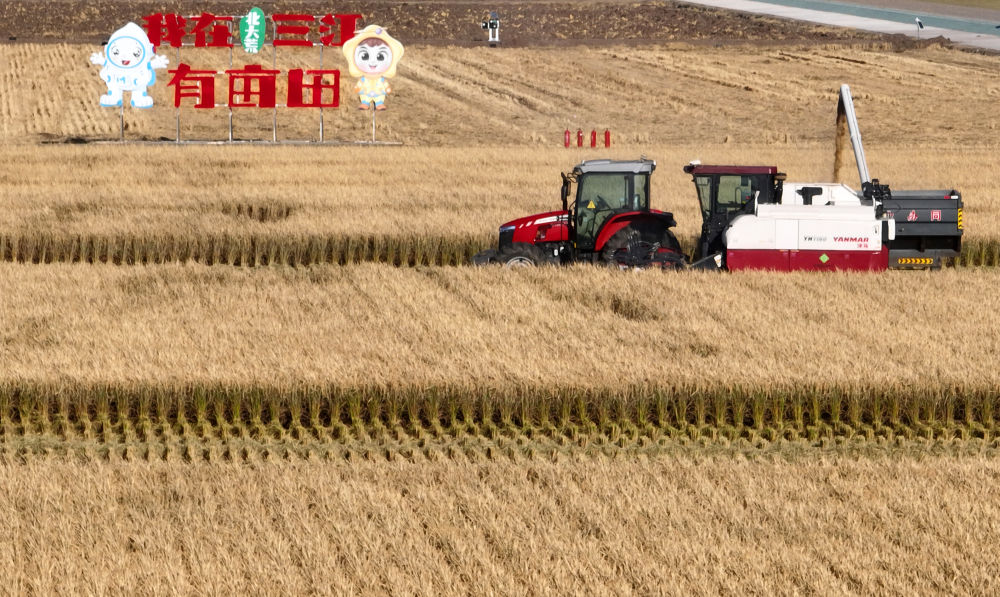 ??龍江大地,金風送爽,稻浪滾滾。建三江七星農(nóng)場萬畝大地號豐收在望,10臺收割機一字排開,正在實施聯(lián)合作業(yè)。