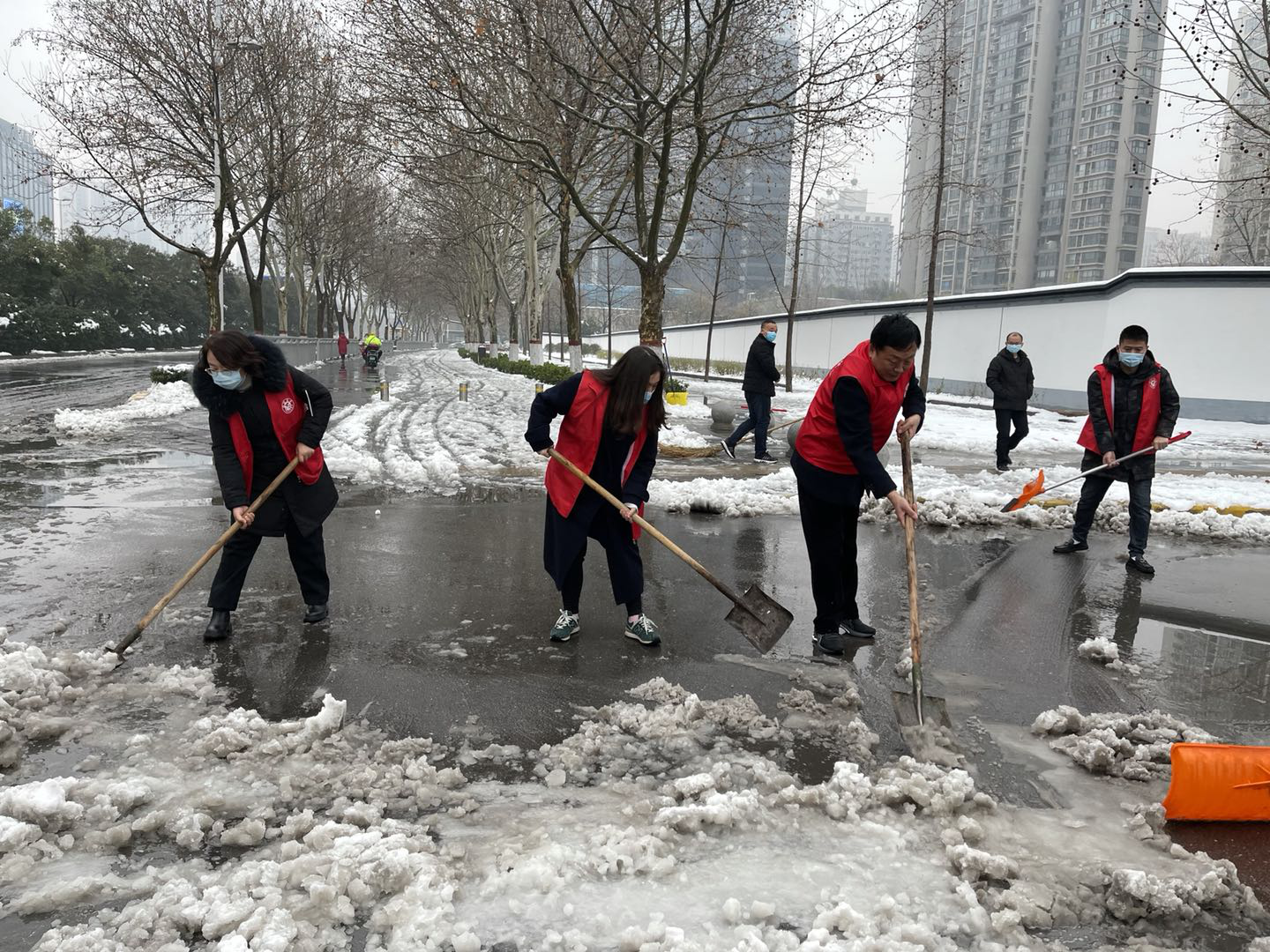 大家不畏嚴(yán)寒,不畏濕滑,齊心協(xié)力,配合默契,鏟的鏟、推的推,每個(gè)人分工明確、團(tuán)結(jié)合作,干得熱火朝天、不亦樂(lè)乎,忙碌的身影構(gòu)成了街邊一道亮麗的風(fēng)景線。
